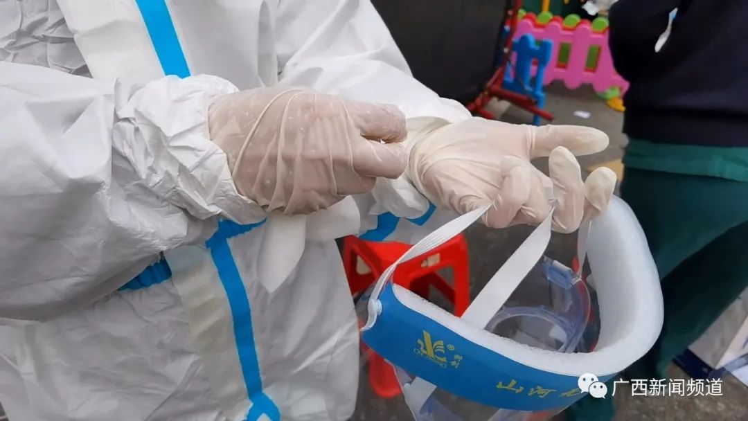 广西中医药大学附属瑞康医院医护人员 赖美渝:我们这一批7点半从医院出发,然后应该是8点半开始,然后我们出来的时候有点凉,后面就多加了一件衣服,然后穿上防护服的时候,可能有点久了,里面不是很透气,就比较热有点闷。