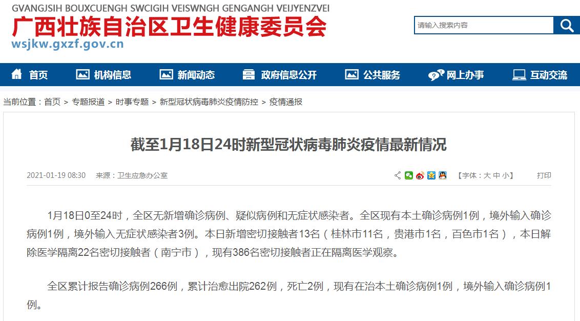 1月18日0至24时,全区无新增确诊病例、疑似病例和无症状感染者。全区现有本土确诊病例1例,境外输入确诊病例1例,境外输入无症状感染者3例。本日新增密切接触者13名(桂林市11名,贵港市1名,百色市1名),本日解除医学隔离22名密切接触者(南宁市),现有386名密切接触者正在隔离医学观察。