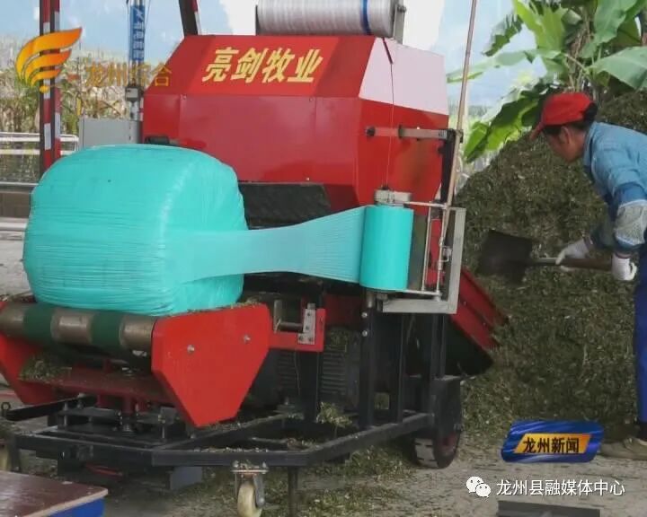 2020年11月9日,位于逐卜乡锦阁村的龙州县战地牧业有限公司蔗叶收贮加工点一片繁忙。在工人操作下,大型铲车将成捆的蔗叶放进切草机,切草机将长长的蔗叶切成均匀的小块饲料,接着经由传送带输送到裹包机压实成圆柱形,随后裹包机左右翻转将圆柱形的饲料包上一层层膜衣,一个750公斤—800公斤的饲料裹包就生产完成了。