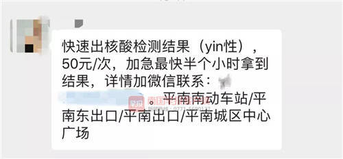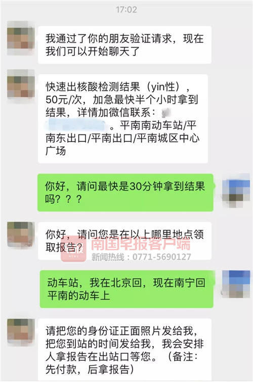 近日,一名从北京经由南宁回平南县的女士,在网上看到“快速出核酸检测结果,加急最快半个小时拿到结果”的小广告后心动了。为了能尽快回到目的地,她立即添加对方为微信好友。