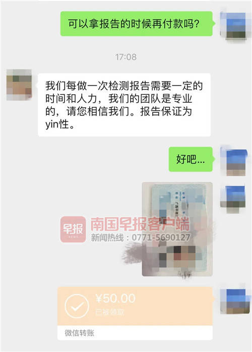 据悉,双方互为好友后,对方要求该女士提供身份证正反面及到动车站时间等信息,同时强调“每做一次检测报告需要一定的时间和人力……报告保证为yin(阴)性”,希望该女士能先付款后拿报告。出于信任,该女士立即从微信转了50元过去。