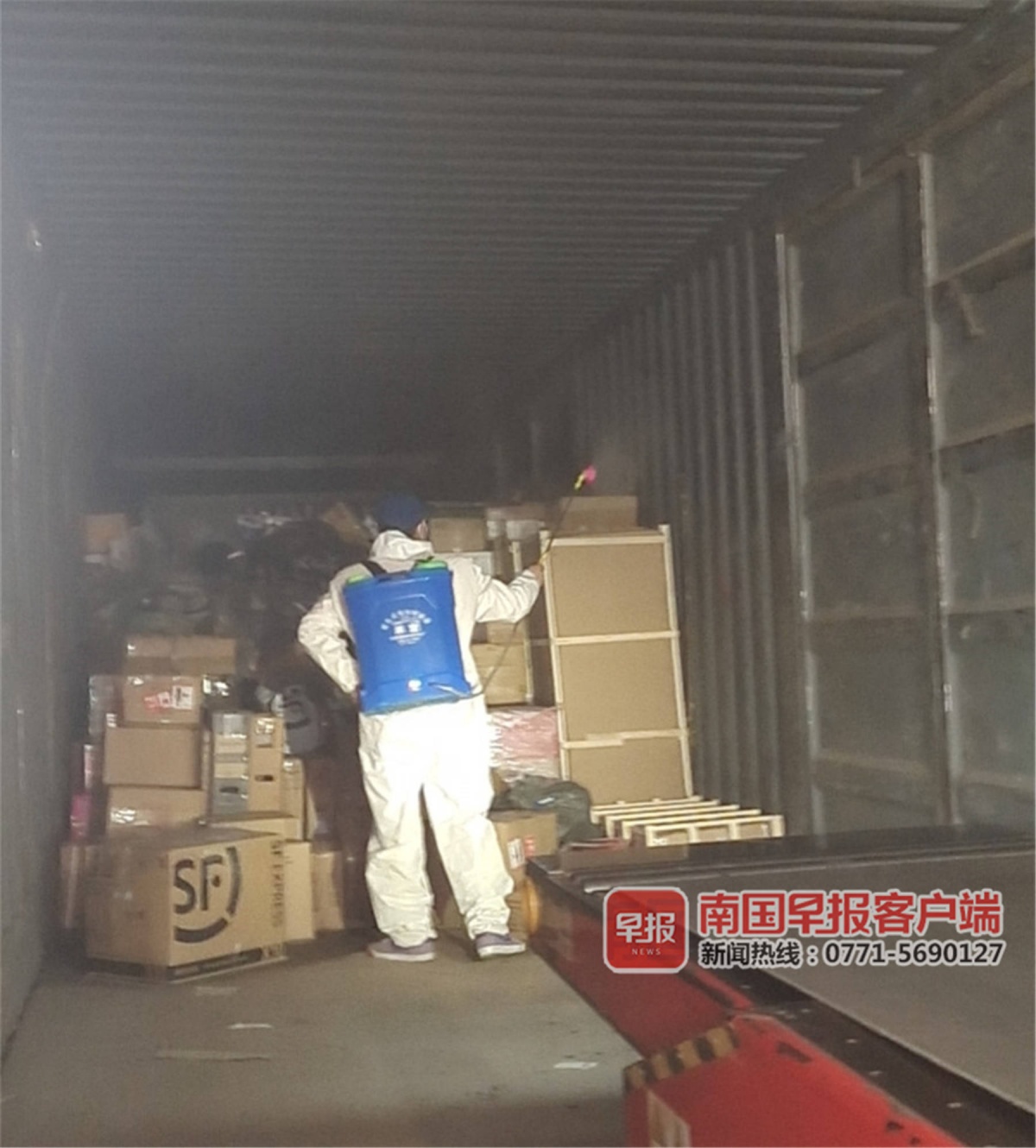 目前,快递寄递迎来一个小高峰,中国邮政集团有限公司南宁市分公司的快递小哥黄志年,每天一早到达友爱营业部时,就必须先用消毒水对场地进行消杀。他告诉记者,实际上,在包裹进来南宁后,就已经在源头进行消杀了。