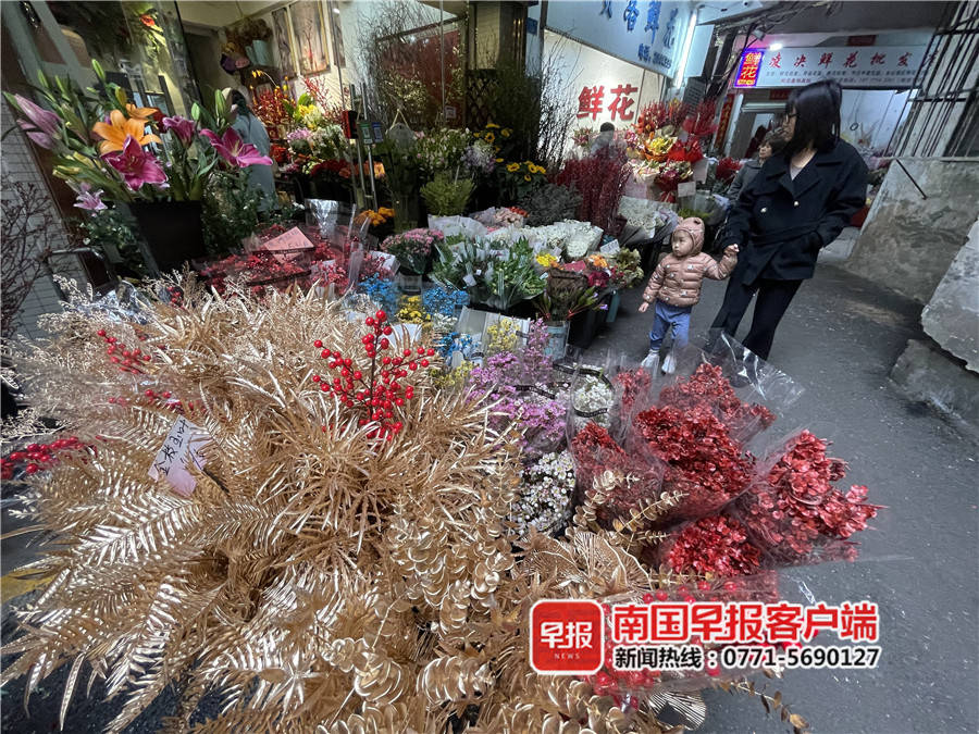 春节将至,鲜花进入许多市民的年货购物清单,南宁鲜花市场上火热起来,其中“金叶子”搭配银柳和红色发财果热销,插在红色的福桶中更显新年氛围。
