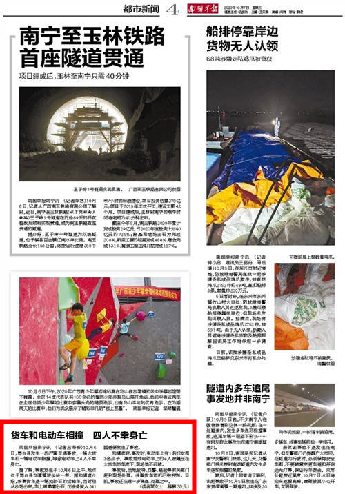 2020年10月6日,在博白县龙潭镇陂头岭一带,发生一起严重交通事故,一辆大货车和一辆电动车相撞,导致电动车上4人不幸身亡。