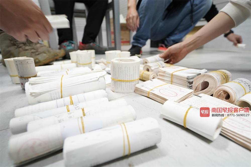 ▲警方清点黄某制作的假火车票。本文图片均为 俸启翔 摄