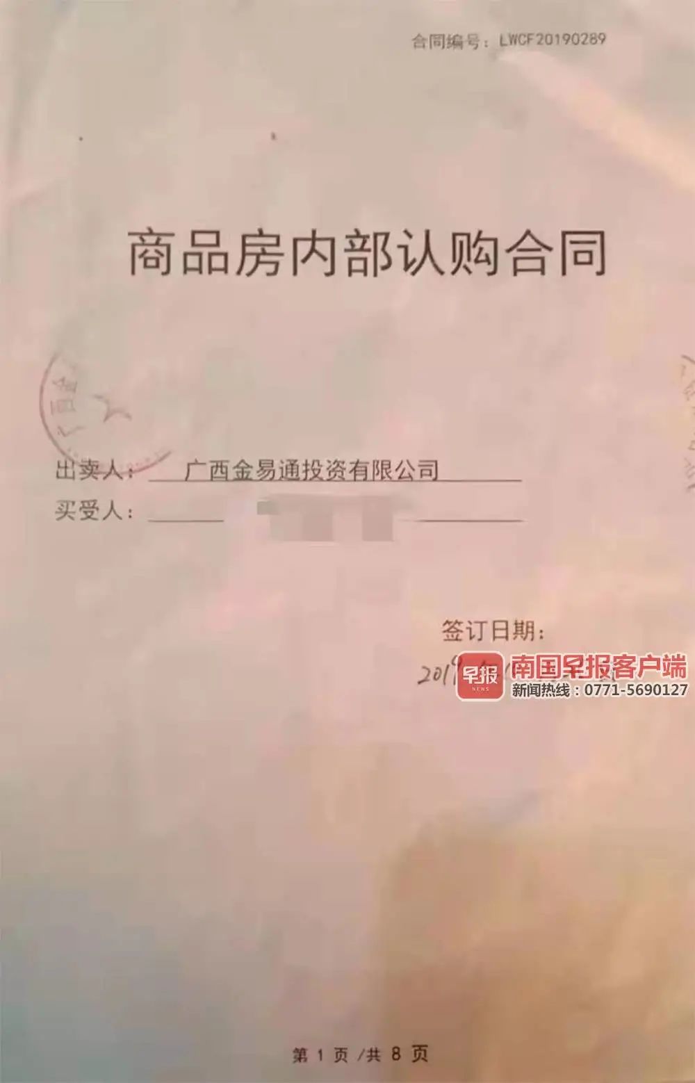 现场看房后,任女士看中一套约74平方米的毛坯房,共36万多元,她全额付了款。2019年10月,任女士收到一份内部订购合同和收据,合同约定2020年4月交房,落款盖章的却是广西金易通投资有限公司。