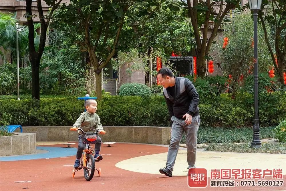 ▲2月10日,南宁市雨过天晴,明秀东路一小区内,市民带着小朋友骑着自行车玩耍。南国早报记者 邹财麟摄