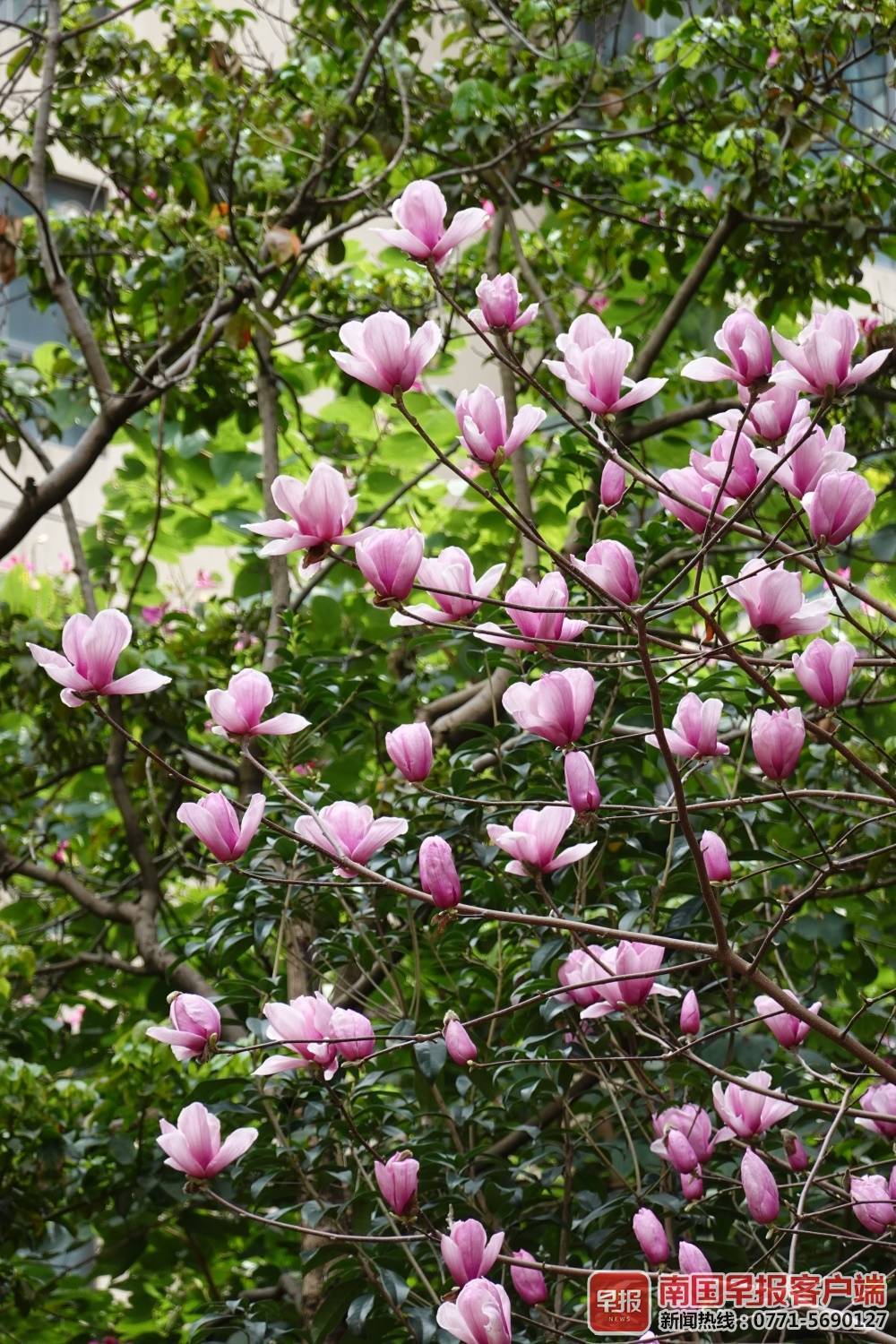 ▲2月10日,南宁市天气转晴,明秀东路一小区内的玉兰树花朵绽放。南国早报记者 邹财麟摄