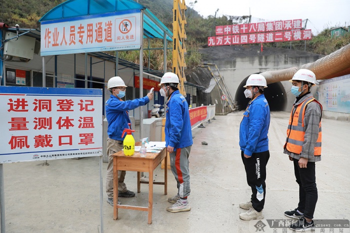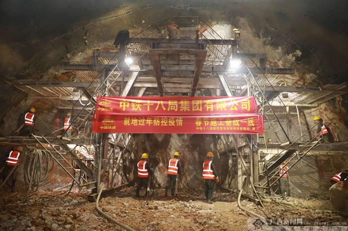 春节前夕,贵南高铁九万大山四号隧道的两个作业面上的风枪作业、防排水施工依然在紧张有序地开展,挖掘机、运泥车进出隧道络绎不绝,隧道三工区经理刘志勇和工友们每天都和上班一样,早早来到了隧道的掌子面开始了一天的工作。“隧道目前的进度有些落后,在家待着过年心里也不踏实。”中铁十八局贵南高铁项目部三工区经理刘志勇对笔者说,他负责的这座隧道全长15485米,是贵南高铁广西段和广西境内现有铁路隧道中最长的一座,由于隧道处于喀斯特岩溶发育区,危岩落石、有害气体以及大量的溶洞和溶腔给施工带来了很大的难度,刘志勇告诉笔者,九万大山四号隧道开工以来,就已经发现各类大小溶洞、溶腔34处,其中一处溶洞高40米,宽50米,纵向长40米,不仅是目前全线隧道挖掘过程中发现的最大溶洞,也是目前广西所有铁路隧道建设过程中遇见的最大溶洞,在全国铁路隧道工程建设史上亦属罕见,掘进一度受到影响,为了将进度抢回来,刘志勇和近百名工友们决定春节留在岗位继续奋战。功夫不负有心人,经过节日期间的努力,隧道掘进突破7800米大关,进度顺利过半,受影响的进度终于被抢了回来。“这是给我们新年最好的礼物。”刘志勇高兴地对笔者说。