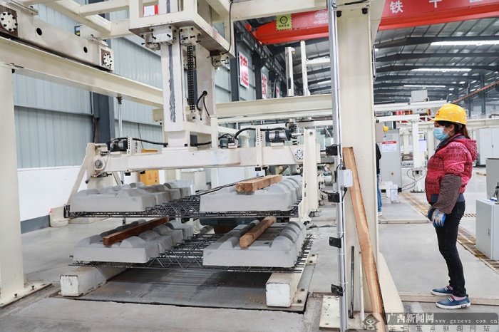 箍钢筋、桁架筋、混凝土入模浇筑,在贵南高铁的智能化轨枕生产厂同样是一派热火朝天的大干景象,50名工人熟练的操作电脑和智能机械臂进行轨枕生产的各项工序作业,为贵南高铁广西段今年中下旬将要开始的无砟道床试验做好充分的准备。“今年春节期间,我们计划生产三万根轨枕,产值可以达到一千万元。”中铁十四局贵南高铁智能轨枕厂经理罗丽军对笔者说。