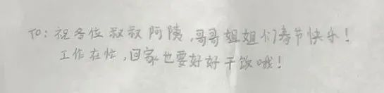 客运员秦梦婷正在组织旅客候乘D2976次列车,突然一名大约10岁左右的小朋友塞给她一张纸,开心地说:祝你们除夕快乐!要多干点饭!