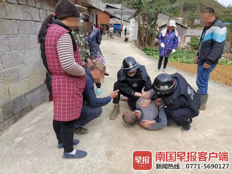 2月17日,百色德保县都安乡男子凌某疑似精神障碍病发作,手持长刀扬言要杀妻儿。民警赶到现场,与村民合力将其控制送医。