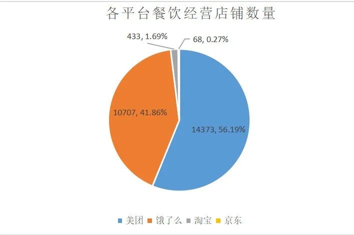 监测美团、饿了么、淘宝、京东4个平台内,南宁市餐饮经营店铺25581家。其中,美团14373家,占56.17%;饿了么10707家,占41.86%;淘宝433家,占1.70%;京东68家,占0.27%。
