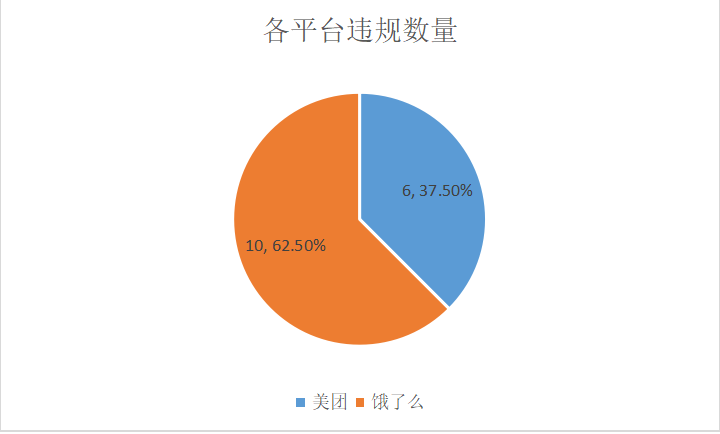 监测发现,各个平台共有涉嫌野生动物禁限售违规店铺16家,监测到违规线索16条,占0.07%。其中,美团违规6家,违规线索6条,占37.5%;饿了么违规10家,违规线索10条,占62.5%。
