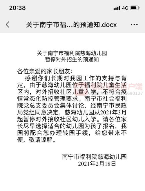 18日晚,有家长反映,南宁市福利院慈海幼儿园在家长群内发布“暂停对外招生的预通知”。通知称,由于慈海幼儿园位于福利院儿童生活区内,对外招收社区儿童入学,不符合疫情常态化防控管理要求,从2021年3月起暂停对外接收社区幼儿入学。请各位家长尽早选择适合的幼儿园为孩子报名,该园将配合家长办理转园手续。