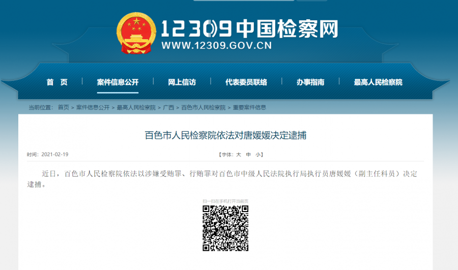 近日,百色市人民检察院依法以涉嫌受贿罪、行贿罪对百色市中级人民法院执行局执行员唐媛媛(副主任科员)决定逮捕。