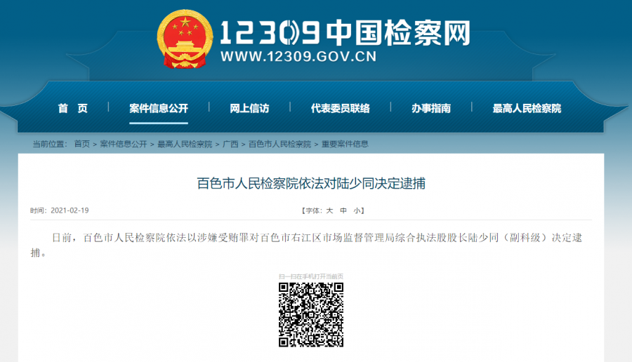 日前,百色市人民检察院依法以涉嫌受贿罪对百色市右江区市场监督管理局综合执法股股长陆少同(副科级)决定逮捕。