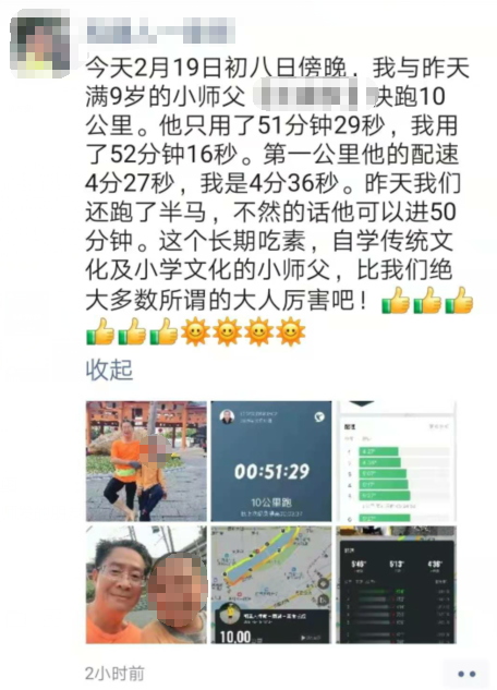 ▲一位男律师发朋友圈说,9岁的跑友壮壮跑完10公里只用了51分29秒,比他还快了一分多钟。