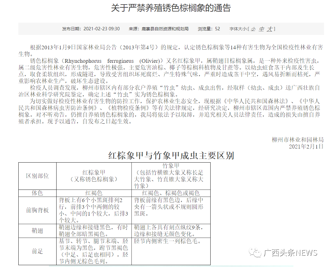柳州市林业和园林局2月1日也发布《关于严禁养殖锈色棕榈象的通告》称,检疫人员调查发现,柳州市辖区内有部分农户养殖“竹虫”幼虫、成虫出售,经取样(幼虫、成虫)送广西壮族自治区林业科学研究院鉴定,确定上述“竹虫”实为锈色棕榈象。经研究决定,柳州市辖区范围内严禁养殖锈色棕榈象。对不听劝告,仍擅自养殖锈色棕榈象的,将依法予以取缔,并追究相关人员法律责任,造成的损失由擅自养殖者承担。