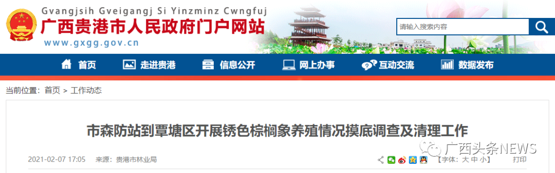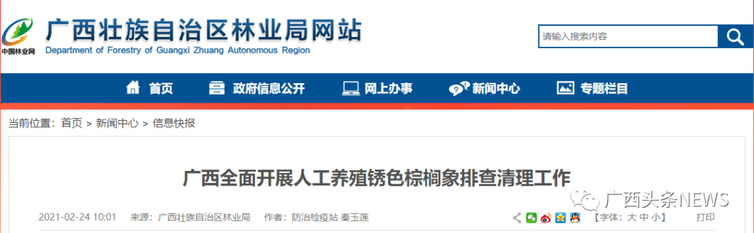 2月24日,广西林业局官网发布《广西全面开展人工养殖锈色棕榈象排查清理工作》的快讯。