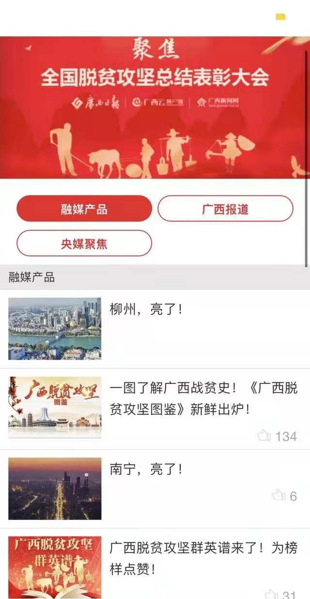 从全国脱贫攻坚总结表彰大会召开前起,连续多日,广西日报-广西云旗下各大新兴媒体,迅速反应,用短视频、海报、H5、创意图片等形式生动传播,与报纸同“屏”共振,在广大网友特别是在年轻人中取得了非常好的宣传效果。
