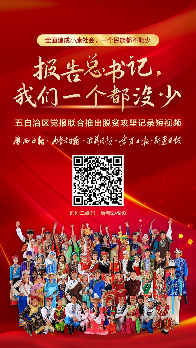 五自治区党报联合推出脱贫攻坚记录短视频“报告总书记,我们一个都没少”,短视频从榜样力量、产业扶贫、易地扶贫搬迁等多角度聚焦广西环江、百色百坭村,内蒙古锡林郭勒、西藏日喀则、新疆叶城县、宁夏西吉等贫困地区各族儿女齐心协力脱贫攻坚的动人瞬间,展现各族群众不获全胜决不收兵的奋斗精神。该短视频通过五自治区党报及其新媒体平台,以及微博、今日头条、抖音、腾讯新闻、网易新闻、百度新闻、人民日报人民号 、新华网新华号等平台全网推出。