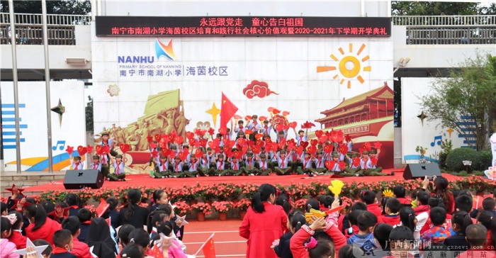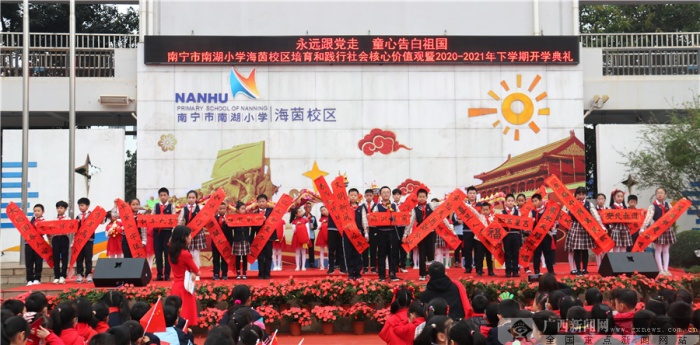 南宁市五象教育集团五象小学以“致敬戍边英雄,做新时代好少年”为主题举行了2021年春季学期开学第一课。通过观看视频、唱诵红歌等方式,加强爱国主义教育和时事思政教育,提高学生的爱国情怀和民族自豪感。