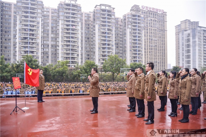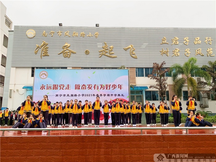 开学仪式上,南宁市凤翔路小学全体师生在庄严的国旗下,隆重举行“永远跟党走 做奋发有为好少年”。学校党支部书记、校长梁建华带领全体党员重温入党誓词。随后,学校口琴队吹奏了《红星歌》,激昂的旋律表达少年儿童感党恩,听党话,跟党走的坚定信念……