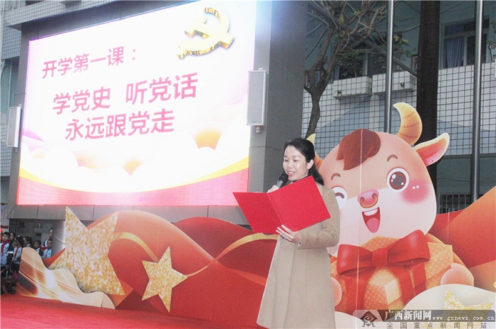 “牛年最牛的祝福送给我心目中最牛的中国共产党员——交警叔叔。因为他们总是不辞辛苦,指挥着车水马龙的交通,让我们安心地出行。”学生代表用设计制作的牛年明信片送给心目中最牛的人。南宁市民主路小学举行了“永远跟党走 奋进新时代”为主题的开学典礼。学校党委书记、校长刘李平为全体师生上开学第一课——《学党史 听党话永 远跟党走》。