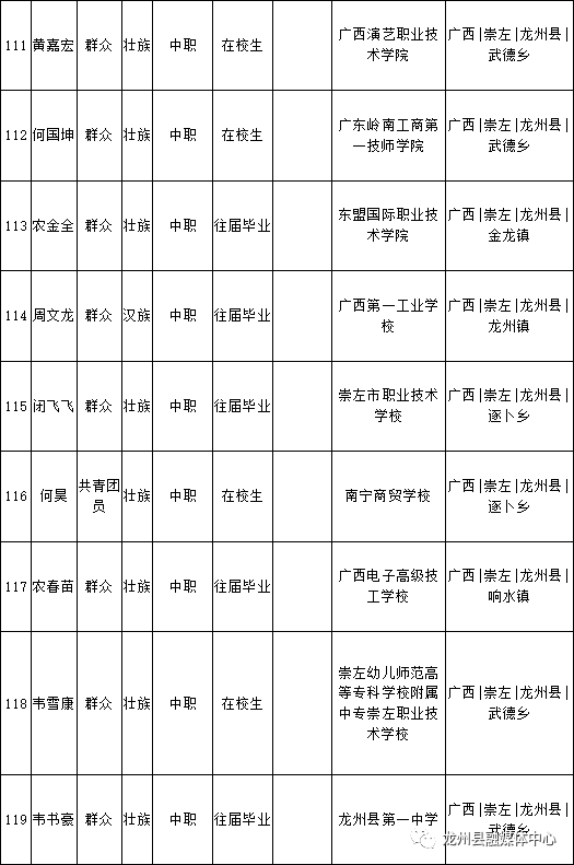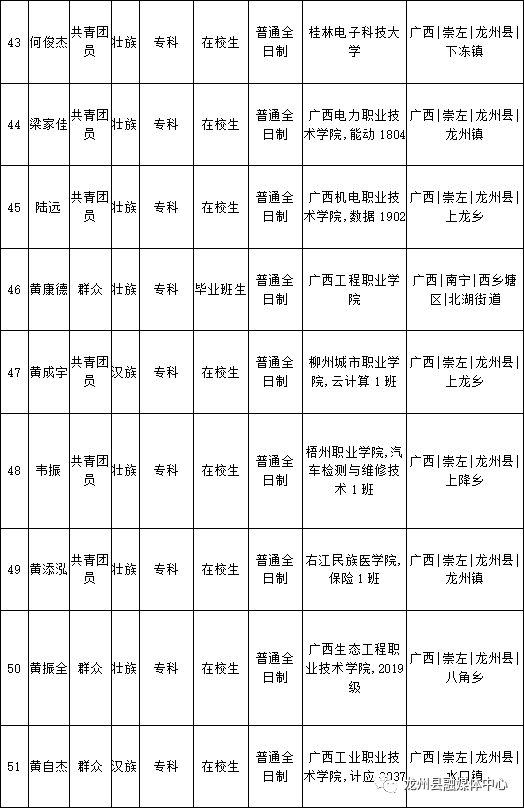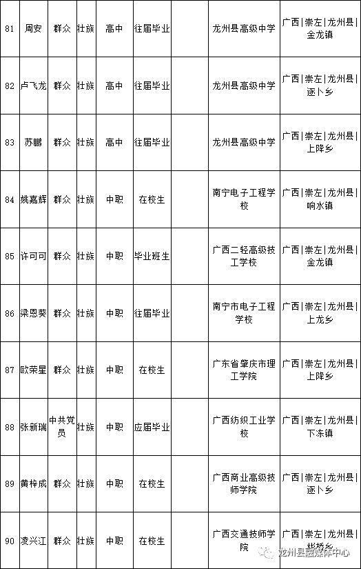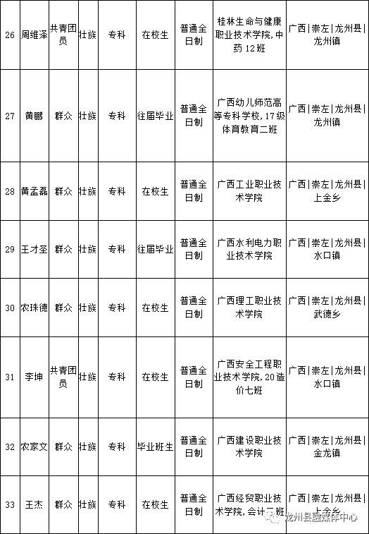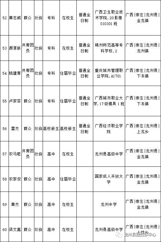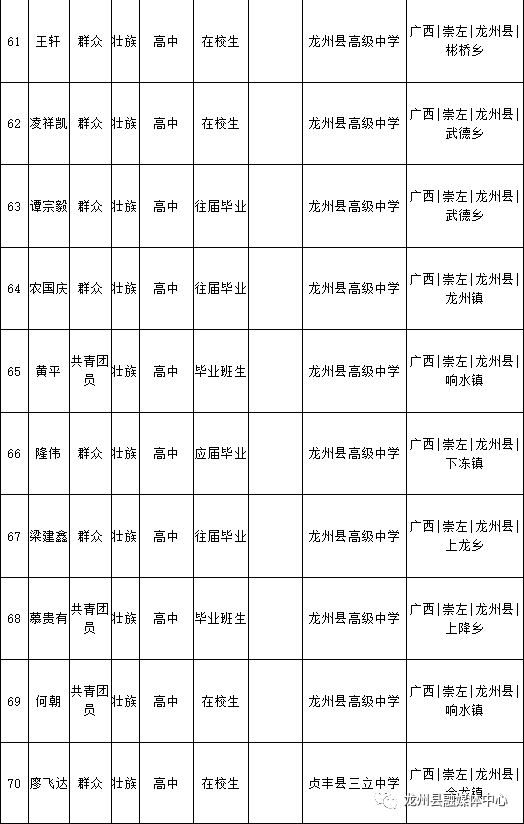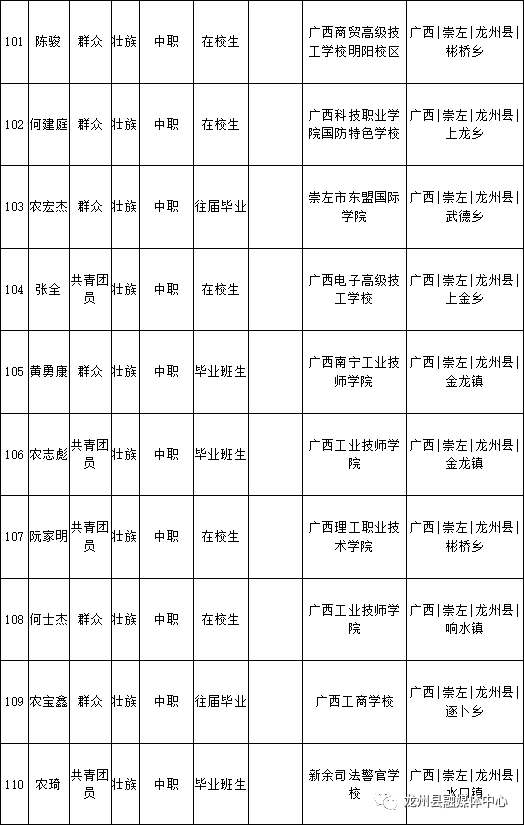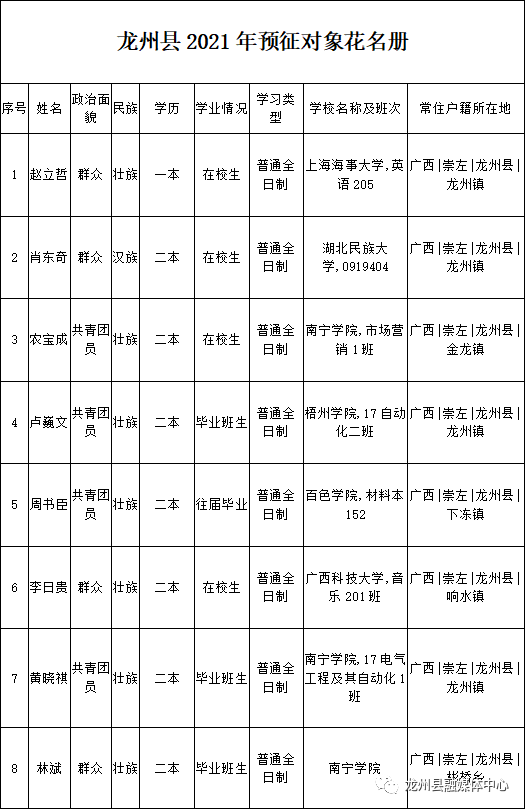 当前龙州县征兵工作已经全面展开根据征兵工作有关规定、经县委征兵办认真整理现将龙州县2021年预征对象花名册公示如下