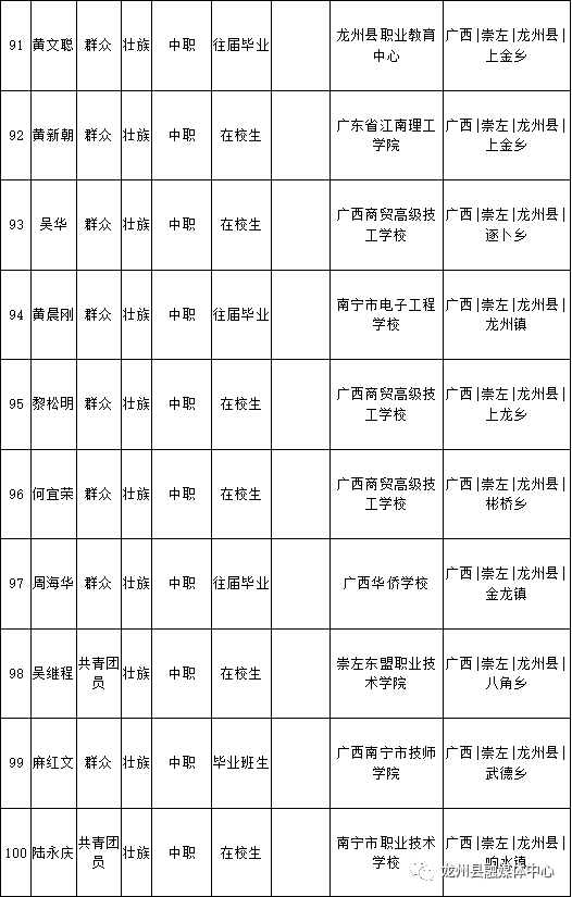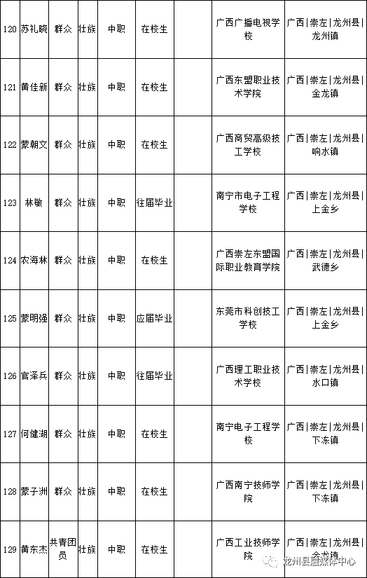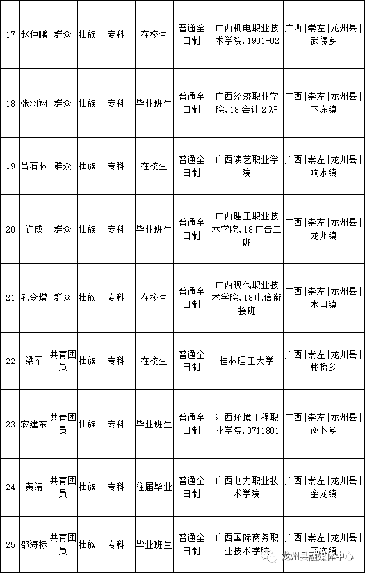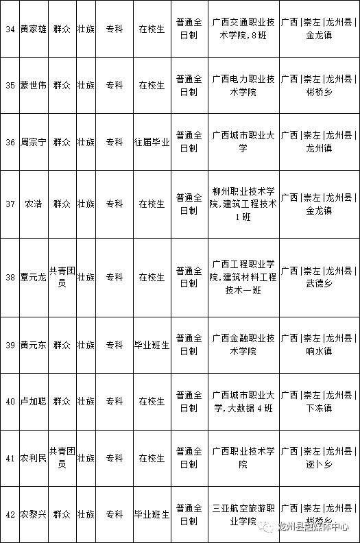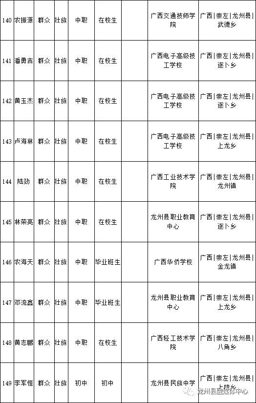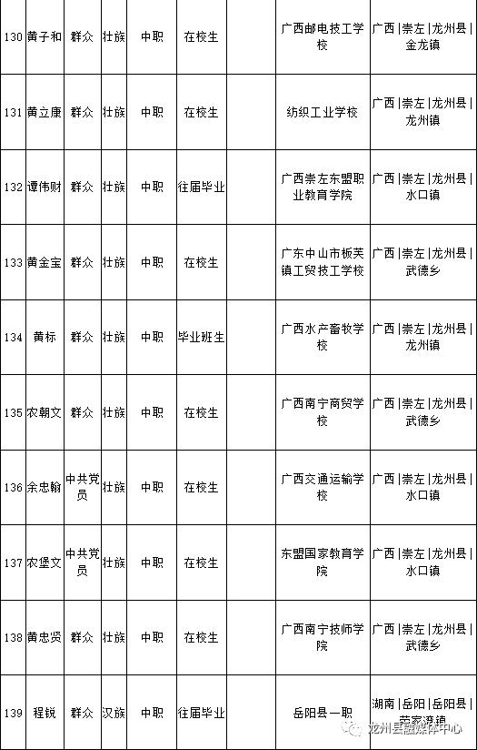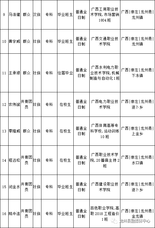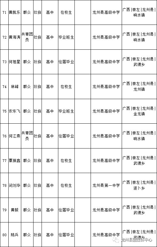 当前龙州县征兵工作已经全面展开根据征兵工作有关规定、经县委征兵办认真整理现将龙州县2021年预征对象花名册公示如下