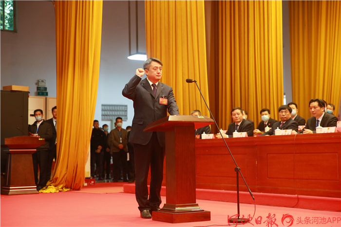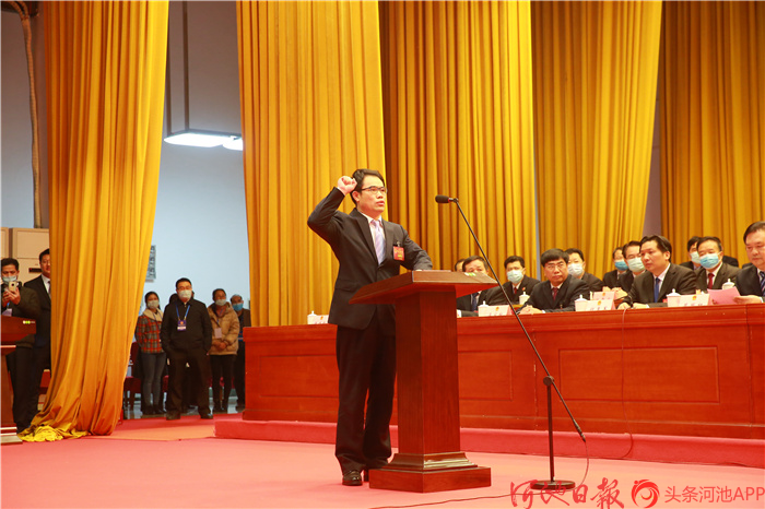 选举会议结束后,新当选的市人民政府市长王军,市人大常委会主任莫振祖,市监委主任徐丹华,市人大常委会委员杨哲举行了宪法宣誓仪式。