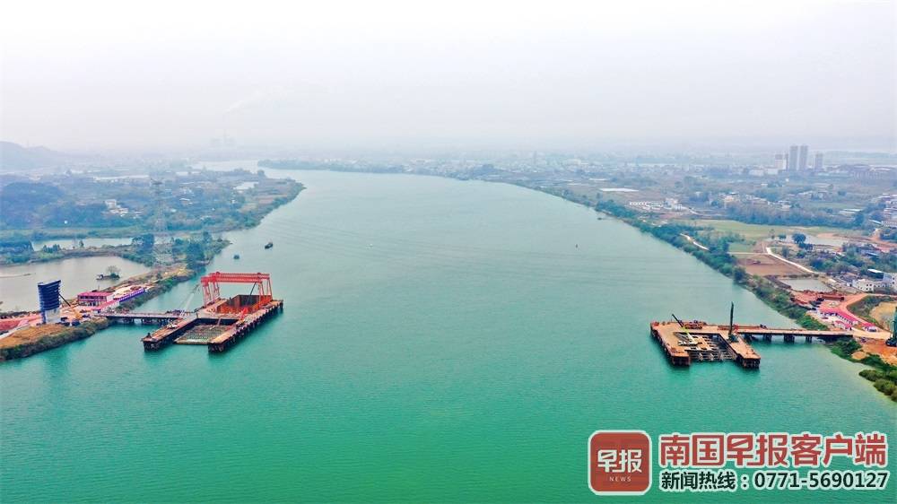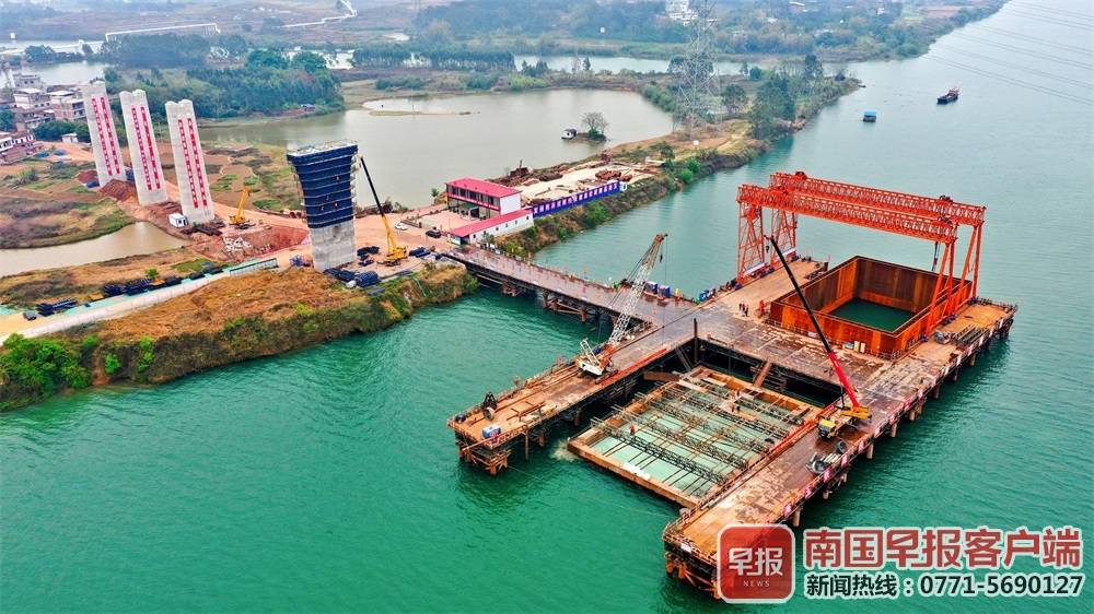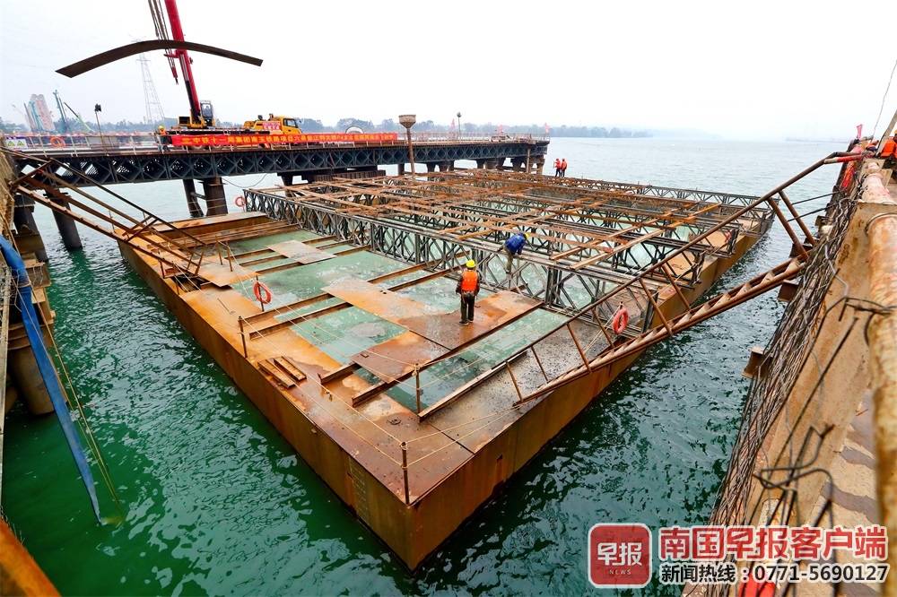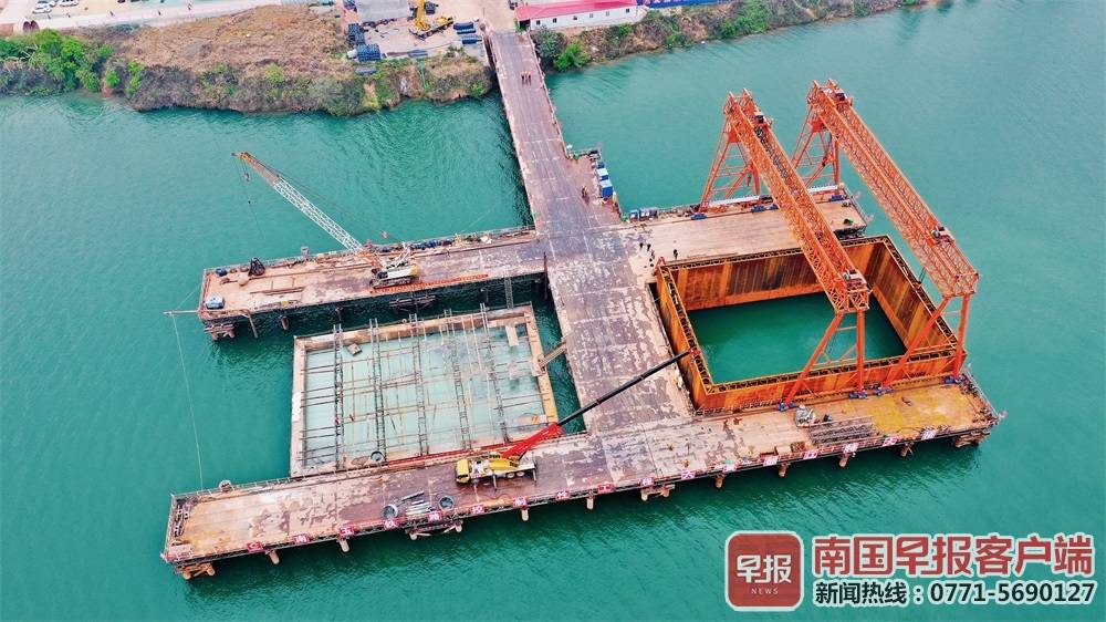 ▲六景郁江特大桥的P4#深水主墩双壁钢围堰顺利完成封底混凝土浇筑,意味着该桥施工工序由水下转为水上。南国早报客户端记者苏华/摄