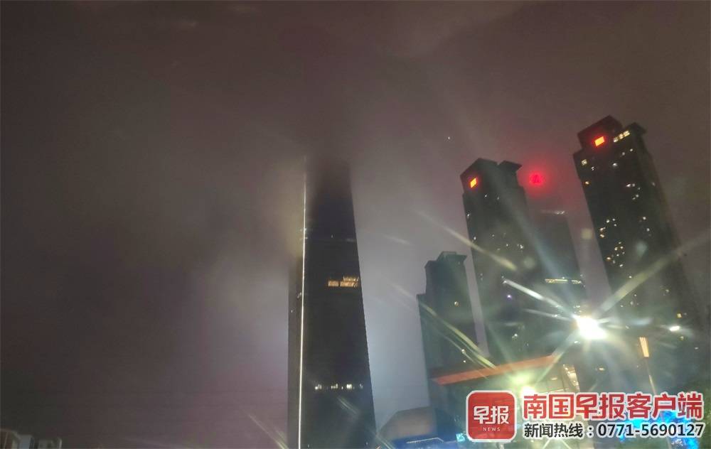 ▲3月3日晚,南宁市民族大道上,一些楼群被雾气笼罩,部分高楼顶部“消失”。南国早报客户端记者何定坚/摄