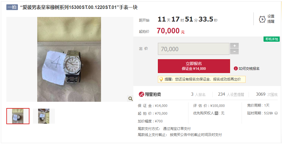 而另一块“爱彼男表皇家橡树系列15300ST.00.1220ST.01”手表,评估价:10万元,起拍价:7万元。