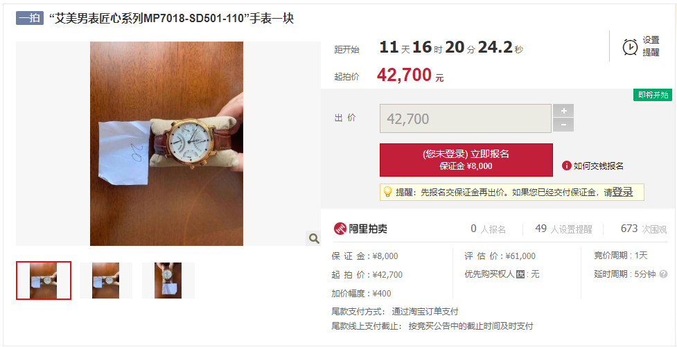 “艾美男表匠心系列MP7018-SD501-110”手表一块,评估价:6.1万元,起拍价:4.27万元。