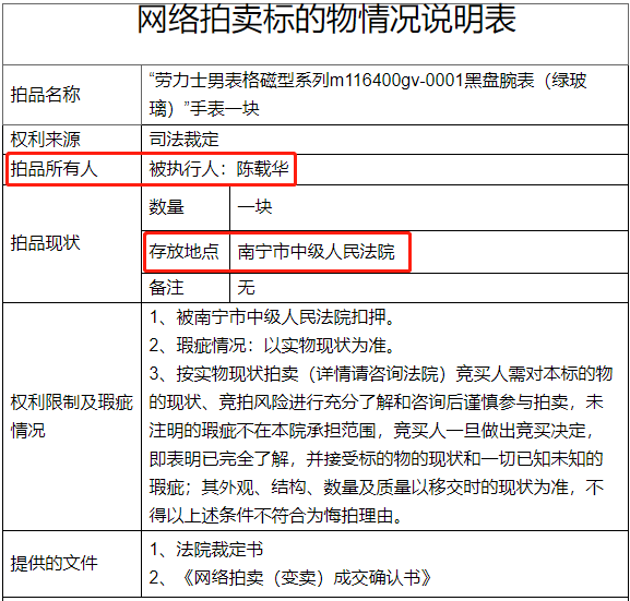记者查阅拍卖公告发现,这些手表都来自同一个被执行人,陈载华。