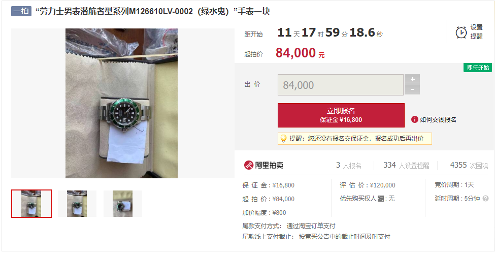 如“劳力士男表潜航者型系列M126610LV-0002”手表一块,评估价:12万元,起拍价:8.4万元。