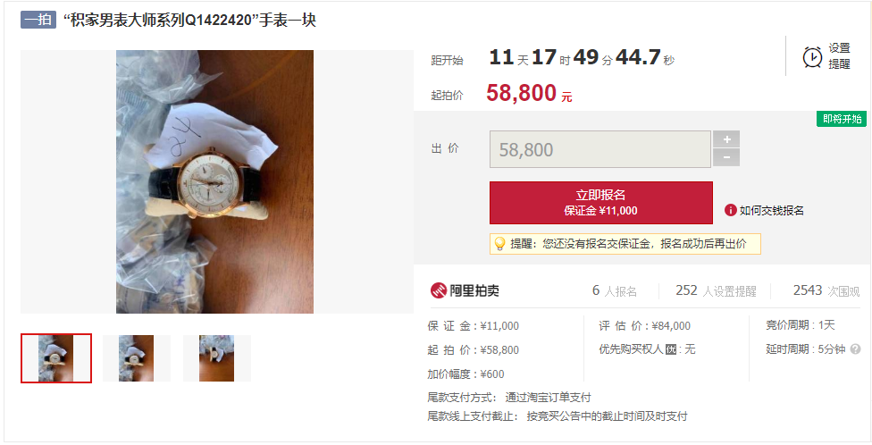“积家男表大师系列Q1422420”手表一块,评估价:8.4万元,起拍价:5.88万元。