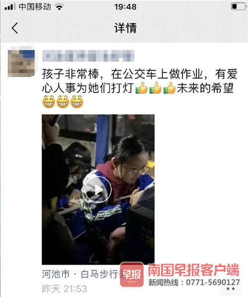 暖心!广西学生公交车上写作业,乘客站着用手机为其照明半小时