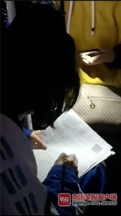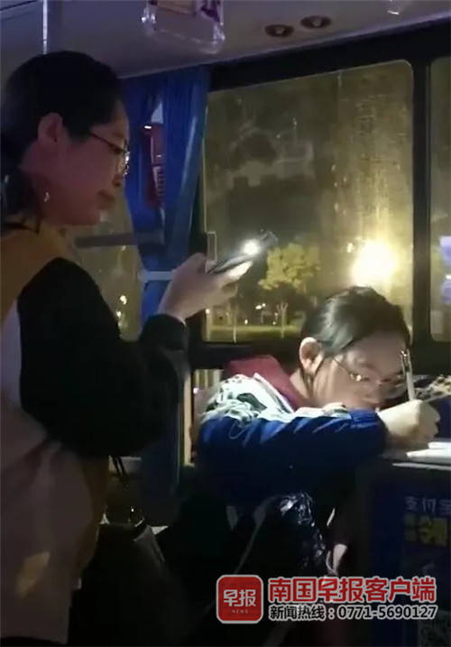 暖心!广西学生公交车上写作业,乘客用手机为其照明