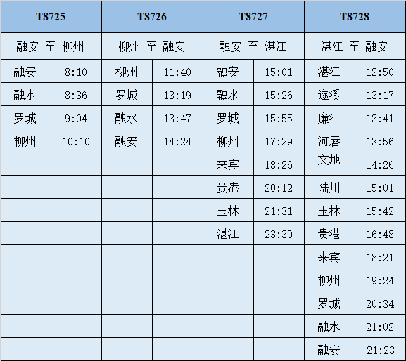 自3月12日起,广西铁路部门加开融安至柳州T8725/6次、融安至湛江T8727/8次2对始发特快旅客列车,满足广西柳州融水苗族自治县、三江侗族自治县、河池罗城仫佬族自治县等周边少数民族聚居地150万老百姓出行需求。