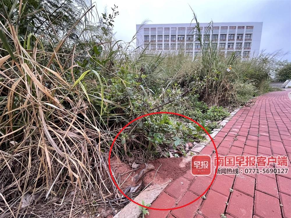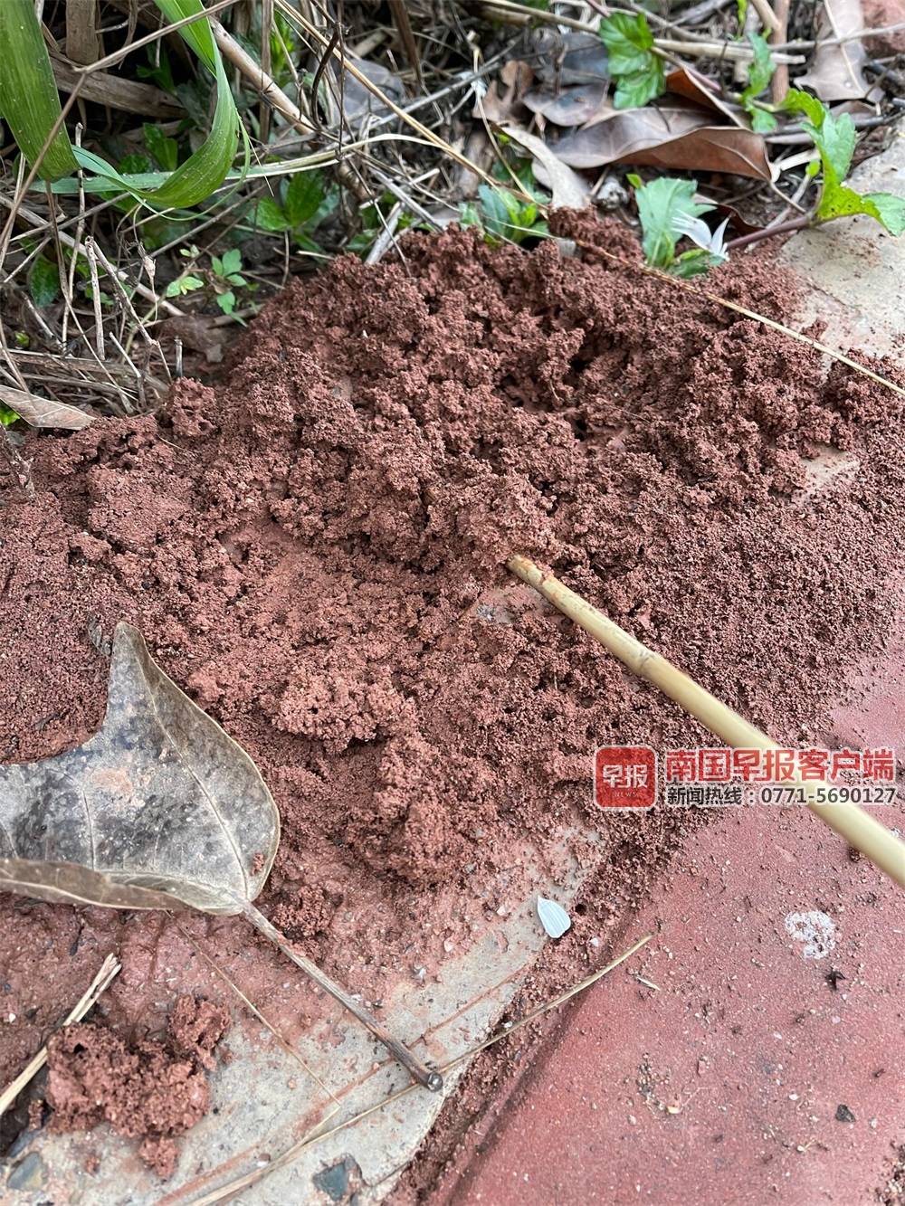 ▲在南宁东站附近的一处绿化带边上,记者发现了一处疑似红火蚁巢穴。南国早报记者 苏华摄