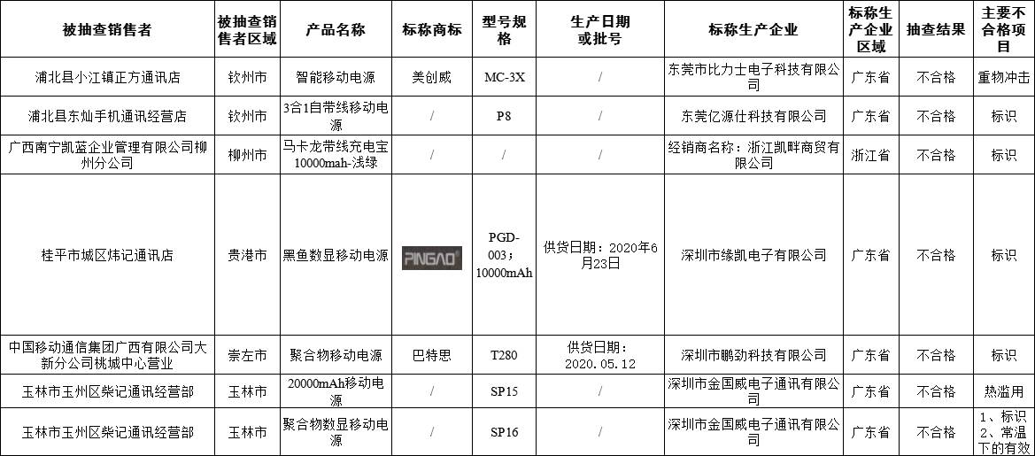 2020年流通领域(实体店)移动电源不合格产品批次名单