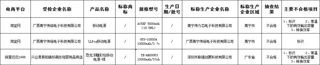 2020年流通领域(电商平台)移动电源不合格产品批次名单