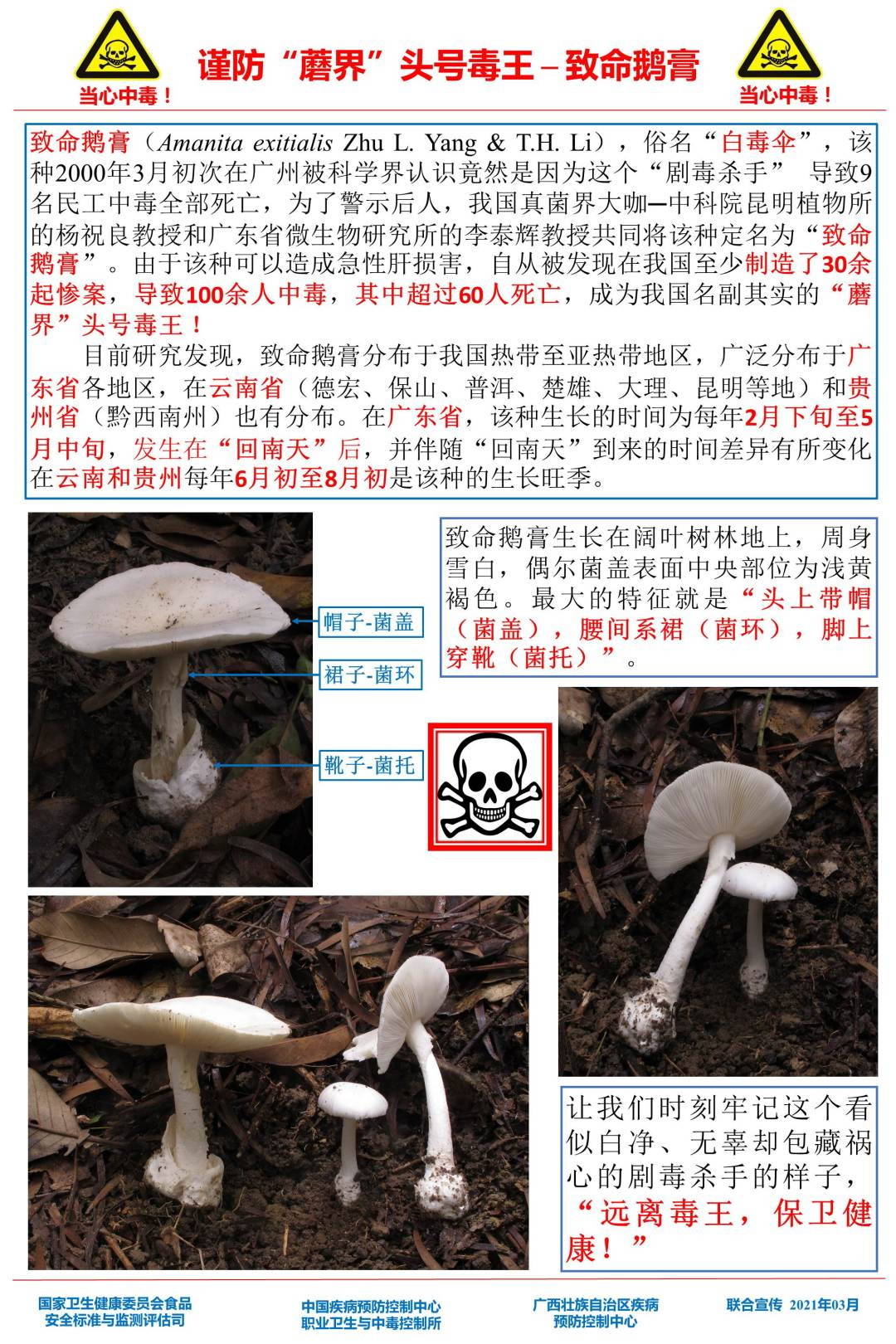 致命鹅膏:全区可能有分布。剧毒,致死毒素为鹅膏肽毒,对人的致死剂量为0.1mg/kg体重,一个中等大小的子实体足以毒死一个成年人。2021年3月,已在广东深圳发现此菌踪迹。