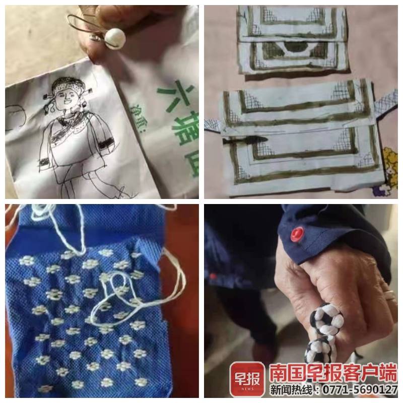 ▲韦小花母亲画出老家妇女服饰,还制作了耳环样式(左上);韦小花母亲绣的老家妇女头巾包边花样(左下);韦小花母亲画的背小孩用的背带和妇女用的钱包(右上);韦小花母亲做的衣服盘扣(右下)。受访者供图