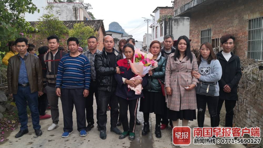 ▲分别29年后,李金贵(右六黑衣者)与母亲(捧花者)、妹妹(右三格子衣者)及亲属合影。南国早报客户端记者王世杰/摄