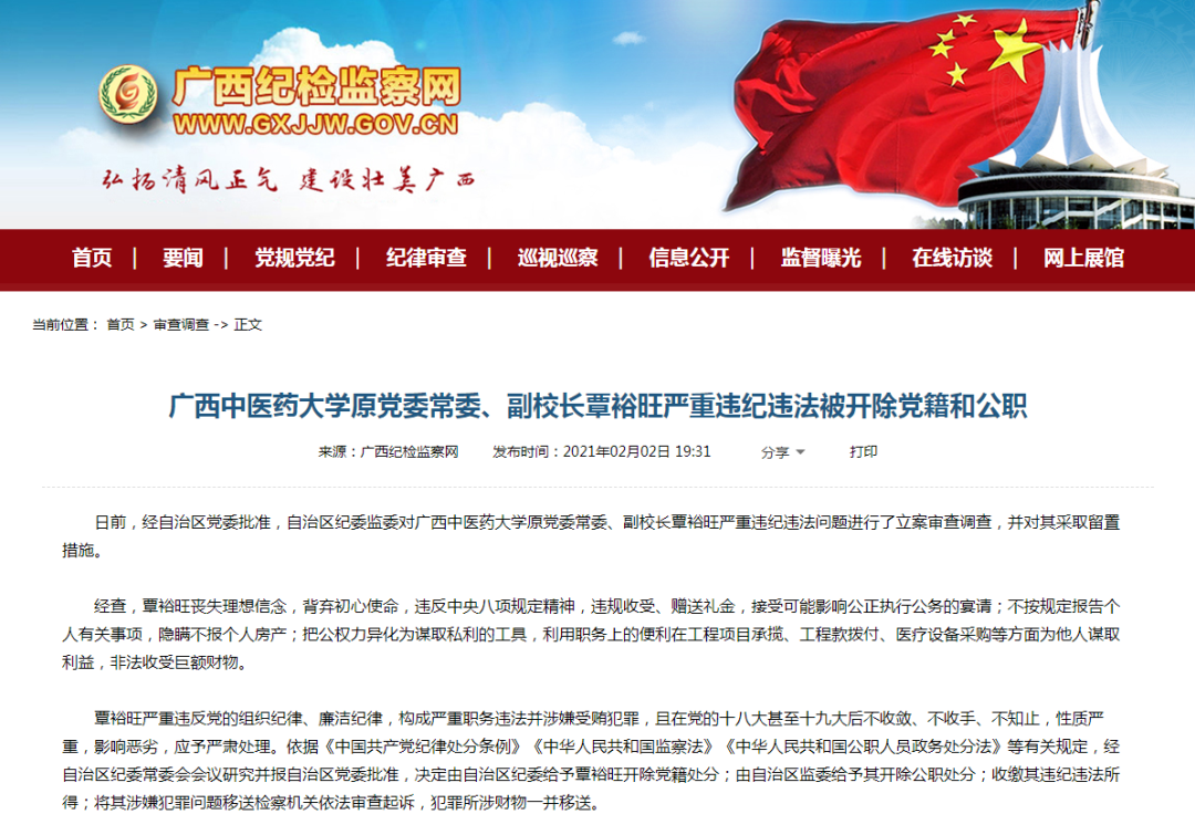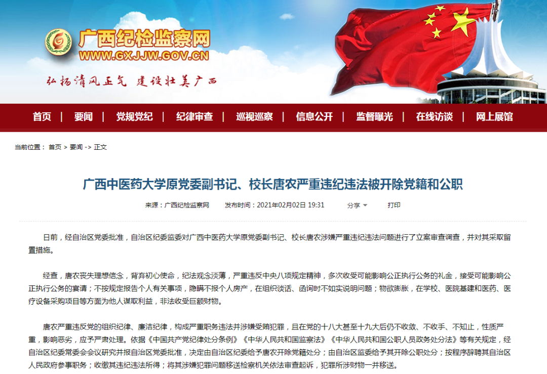 据悉,2020年该校正副校长也一同“落马”。2020年10月3日,广西纪检监察网在国庆假期期间发布消息,广西中医药大学党委副书记、校长唐农,党委常委、副校长覃裕旺,两人涉嫌严重违纪违法被查。