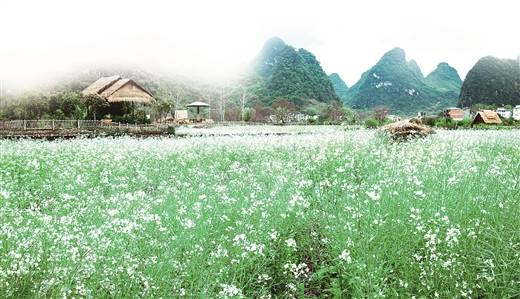 桂林中国国际旅行社工作人员周云涛介绍,除了油菜花,白色的萝卜花也正值盛花期,连绵起伏的青山下,一片洁白的萝卜花,观赏起来别有风味。